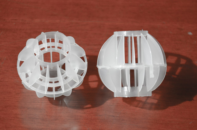 多面空心球中間鏤空結(jié)構(gòu)形成空隙大,不易被阻塞的特性。這種結(jié)構(gòu)在空氣洗滌、廢氣吸收、灰塵過濾等廢氣處理工程方面應(yīng)用,具有處理風(fēng)量大、阻力小的特點。由于多面空心球的空隙中有較高的滯液量,可使塔內(nèi)液體停留時間長,從而增加了氣體與液體的接觸面積和接觸時間,便廢氣得到充分吸收處理。