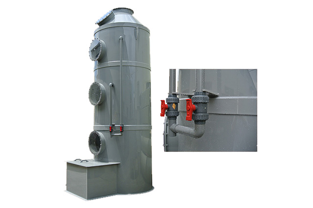 PPs洗滌塔結構:洗滌塔由除霧層、噴淋層、填料層、風機、風管、塔體、供水箱、供水泵等部分組成。洗滌塔系統的風機組將收集到的廢氣吸入酸霧PPs阻燃洗滌塔內,流經填料層段(氣/液接觸反應介質),讓廢氣與填充物表面流動的藥液(洗滌液)充分接觸,以吸附廢氣中所含的酸性或堿性污物,廢氣經過洗滌后,達標排放。
